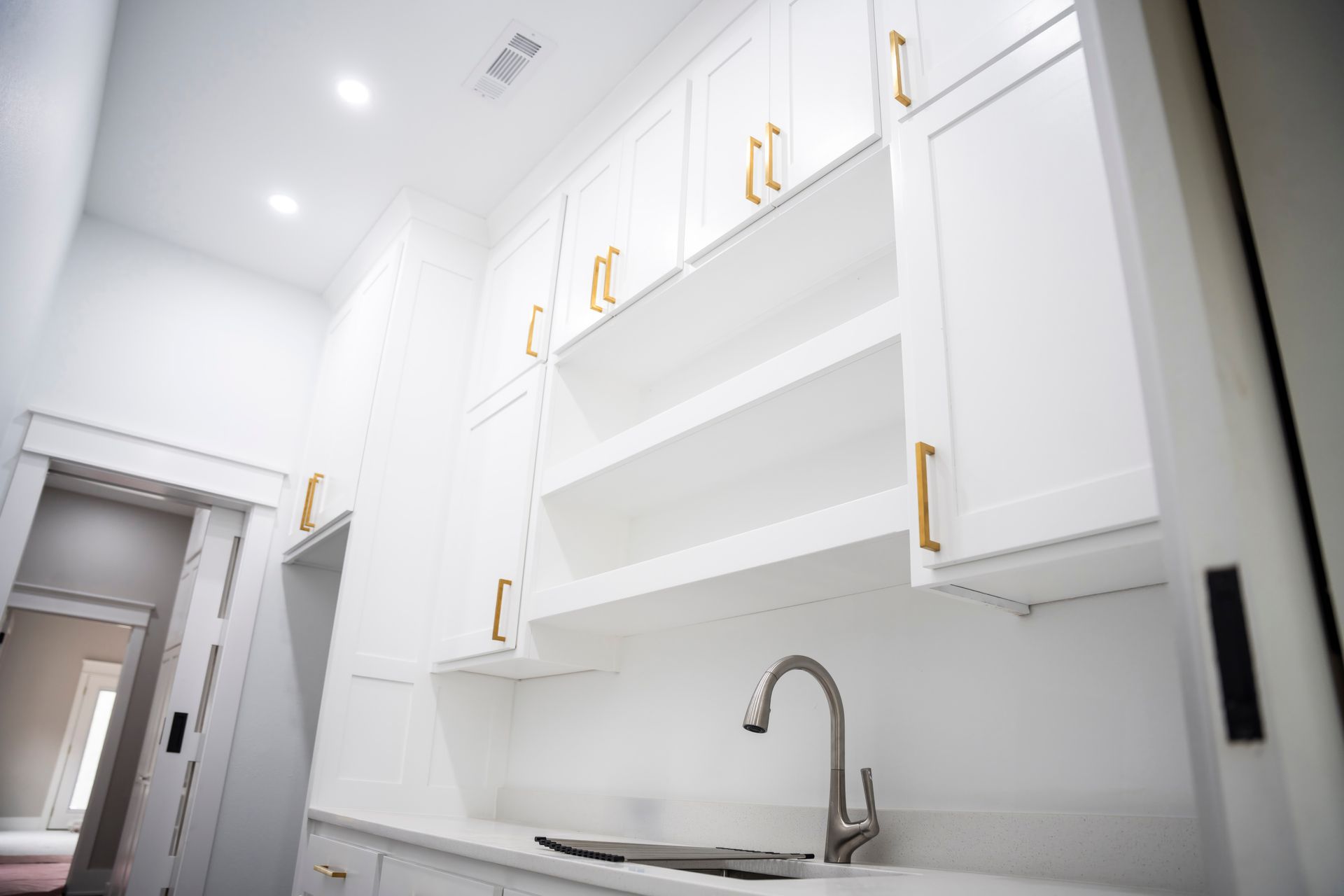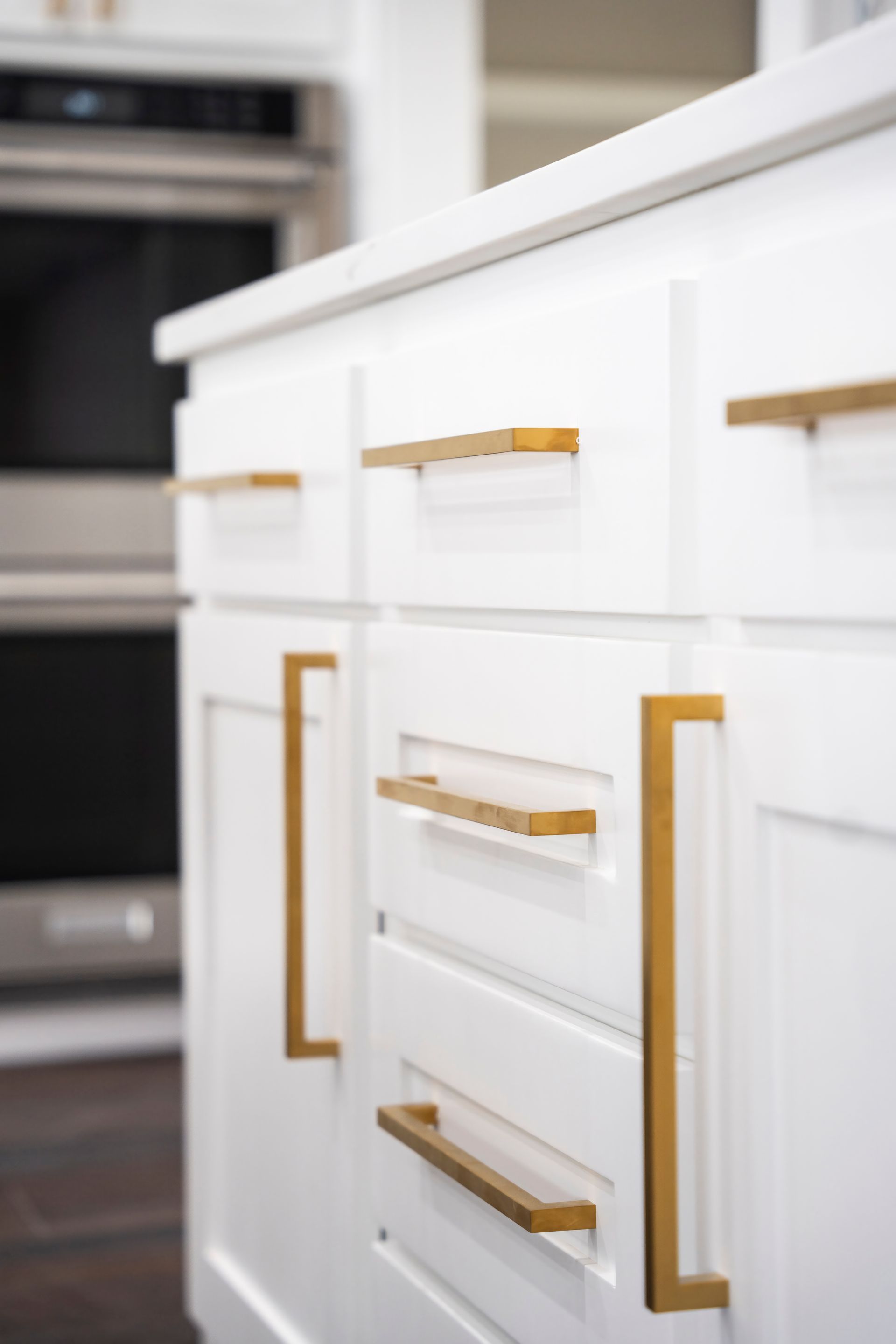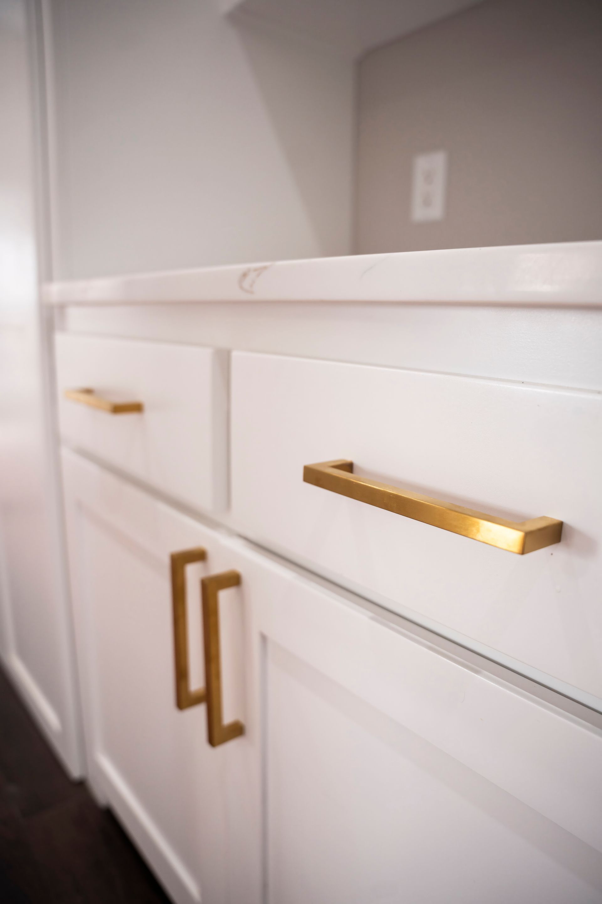 Our latest completed project is the epitome of timeless elegance and contemporary luxury. It beckons you into a world where sophistication meets functionality, where the marriage of white shaker-style cabinets and opulent gold cabinet hardware creates a visual masterpiece that is both inviting and awe-inspiring.