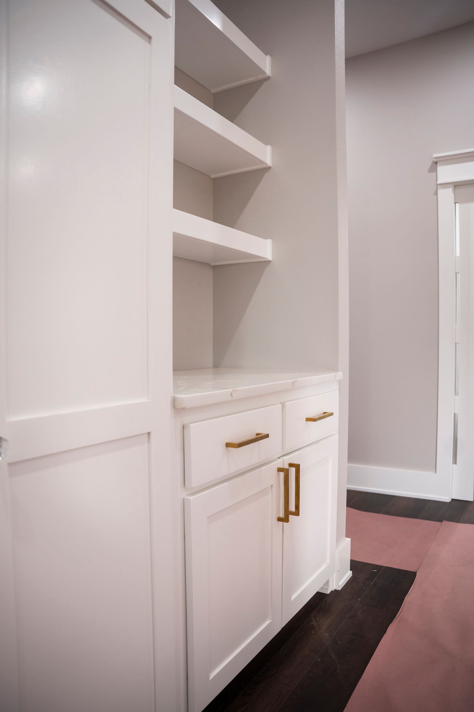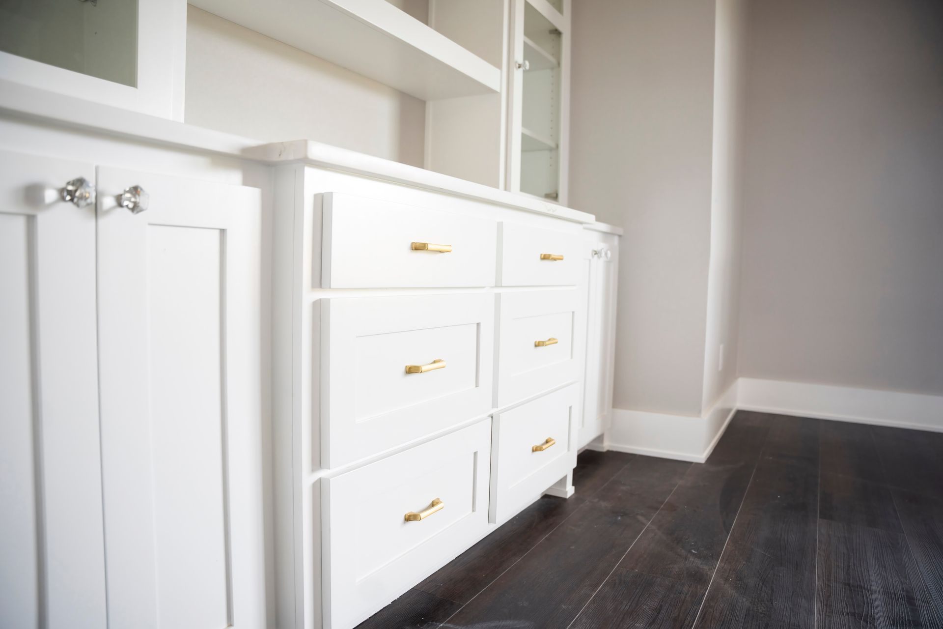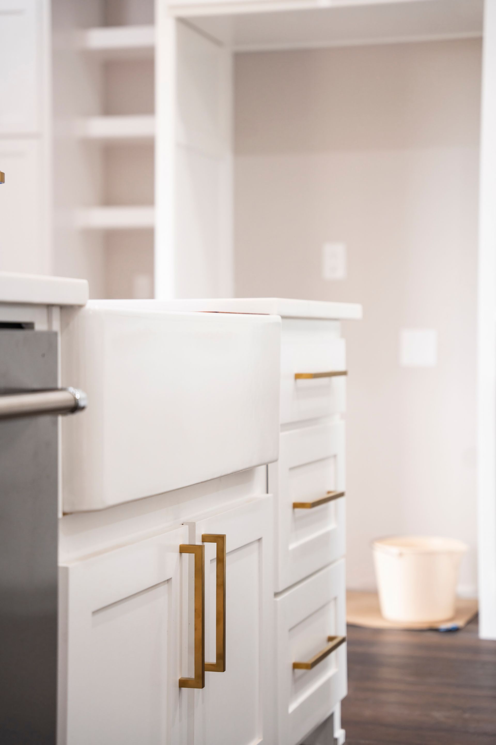 Our latest completed project is the epitome of timeless elegance and contemporary luxury. It beckons you into a world where sophistication meets functionality, where the marriage of white shaker-style cabinets and opulent gold cabinet hardware creates a visual masterpiece that is both inviting and awe-inspiring.